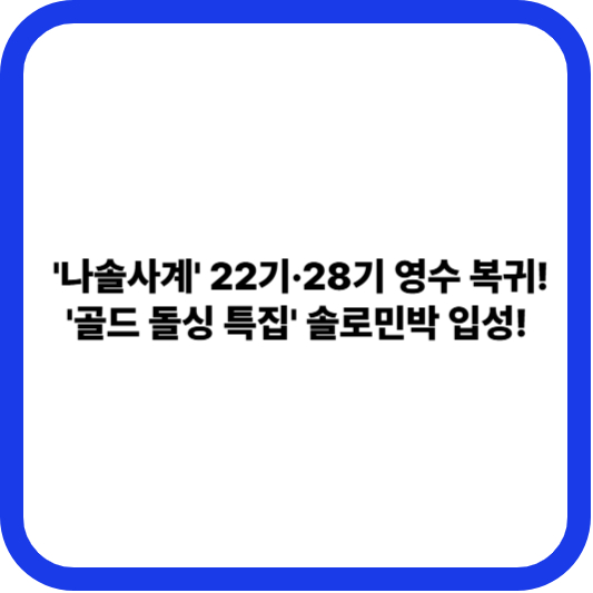 SBS Plus, ENA의 화제의 프로그램 '나는 SOLO, 그 후 사랑은 계속된다' (이하 나솔사계)가 역대급 라인업으로 돌아옵니다. 오는 18일 오후 10시 30분 방송을 앞두고, '골드' 출연진과 '돌싱' 출연진이 만나는 새로운 '골드 돌싱 특집'의 재림이 예고되어 시청자들의 기대가 최고조에 달하고 있습니다.