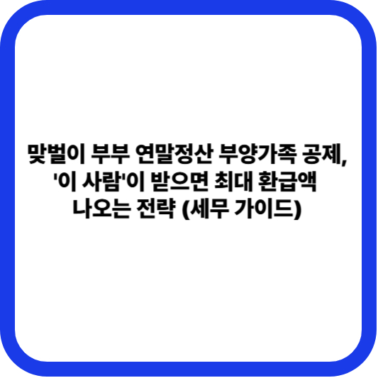 맞벌이 부부는 연말정산 전에 서로의 **총급여액과 예상 세금 구간**을 확인하고, 기본 공제는 고소득자에게 일괄 배분하는 것을 원칙으로 합니다. 이후 의료비, 신용카드 공제 등은 각 항목의 특성을 고려하여 유리한 배우자에게 배분함으로써 부부 합산 최대 환급액을 달성할 수 있습니다.