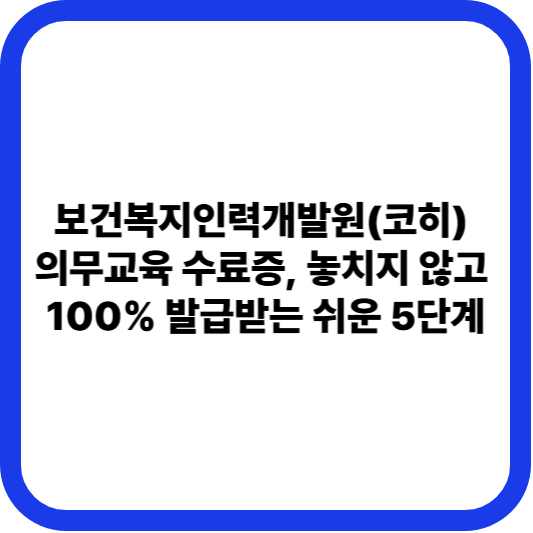보건복지인력개발원(KOHEI, 일명 코히)은 사회복지 및 보건 분야 종사자들이 법적으로 이수해야 하는 필수 교육을 제공하는 핵심 기관입니다. 의무교육은 단순한 시간이수가 아니라, 수료증 발급까지 정확히 완료해야 법적 의무가 충족됩니다. 복잡하게만 느껴지는 코히 온라인 교육, 수강부터 수료증 발급까지 5단계로 쉽고 빠르게 끝내는 방법을 알려드립니다.
