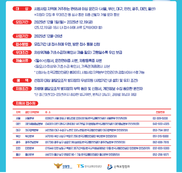 고령 운전자를 위한 페달오조작 방지장치 무상지원 기회를 놓치지 마시고, 모집 기간(~12월 19일 18:00) 내에 차량 조건을 필히 확인하여 지원해 주시기 바랍니다.