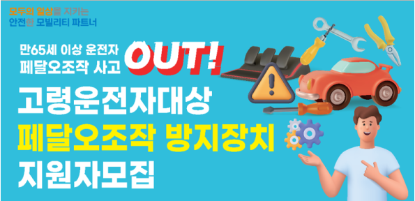 고령운전자의 안전운전을 돕기 위한 ‘페달오조작 방지장치 2차 보급 시범사업’ 지원자를 모집합니다. 선정 시 해당 장치를 무상으로 지원받아 안전하고 편안하게 운전할 수 있는 기회이므로, 만 65세 이상 운전자분들의 많은 관심과 지원 바랍니다.