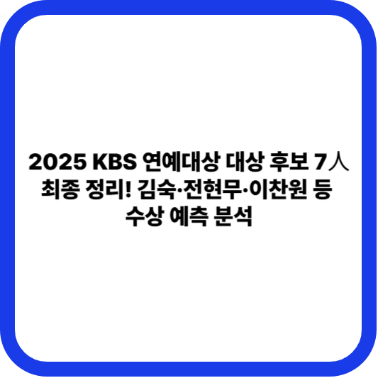 2025년 KBS 예능을 빛낸 별들의 축제, ‘2025 KBS 연예대상’ 시상식이 오는 12월 20일(토) 개최를 확정했습니다. 올해는 역대급 7명의 대상 후보가 공개되며 시청자들의 관심이 최고조에 달하고 있습니다. 과연 2025년 KBS 예능의 최고 영예인 대상 트로피는 누구에게 돌아갈지, 대상 후보들의 주요 활약과 유력 수상자를 집중적으로 분석해 드립니다.